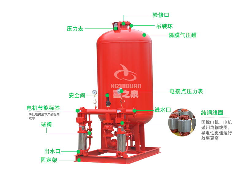消防自動增壓穩壓給水設備是為消防滅火工程配套的設備,主要作用:保持水滅火管網的消防壓力,發生火警打開水滅火設備能立即噴出充實水柱,給報警聯動啟動大消防泵贏得30秒以上的初期滅火撲救時間,直至消防主泵全負荷啟動進行,由于該設備能始終保持管網壓力,使管網不存空氣啟動大消防泵不打嗆管網無顫動危險。并獲得消防產品3CF認證證書。