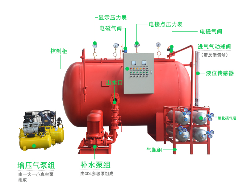 DXZQ型消防氣體頂壓給水設備包括:控制柜、電磁氣閥、液位傳感器、二氧化碳氣瓶、顯示壓力表、氣瓶組等部件。